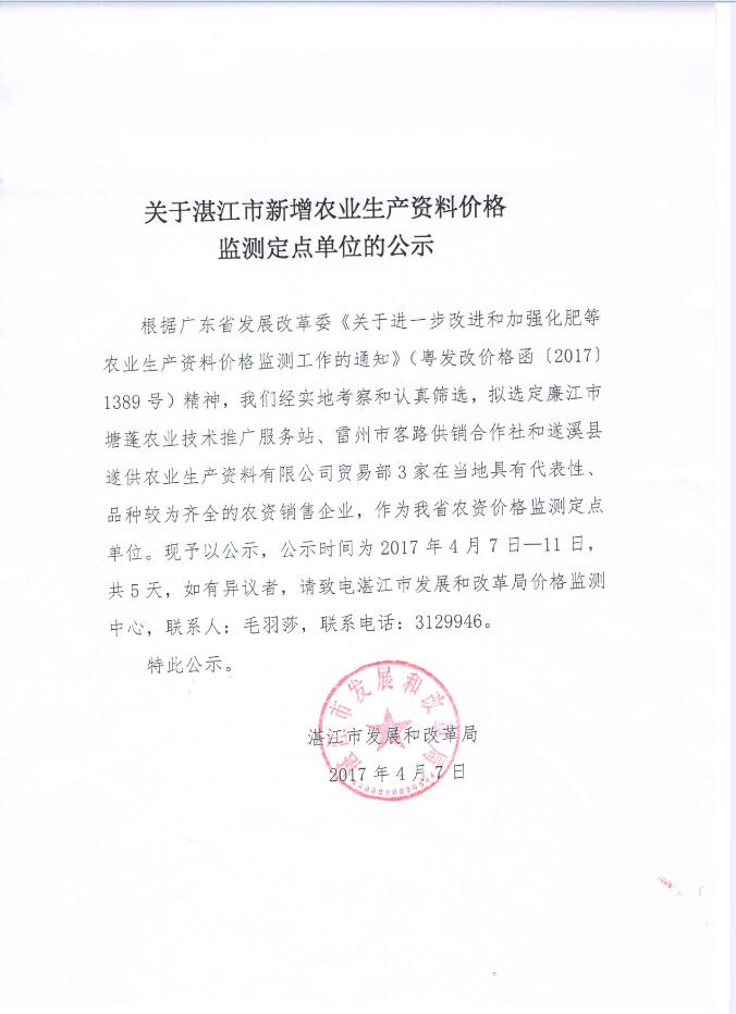 關于湛江市新增農業(yè)生產資料價格監(jiān)測定點單位的公示