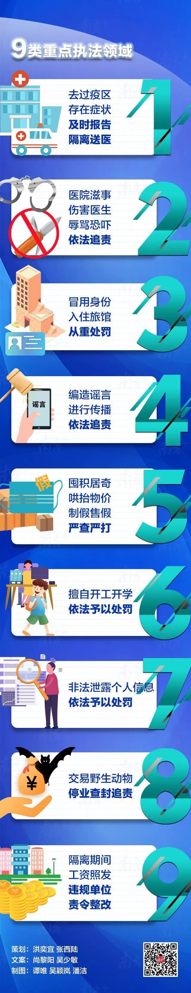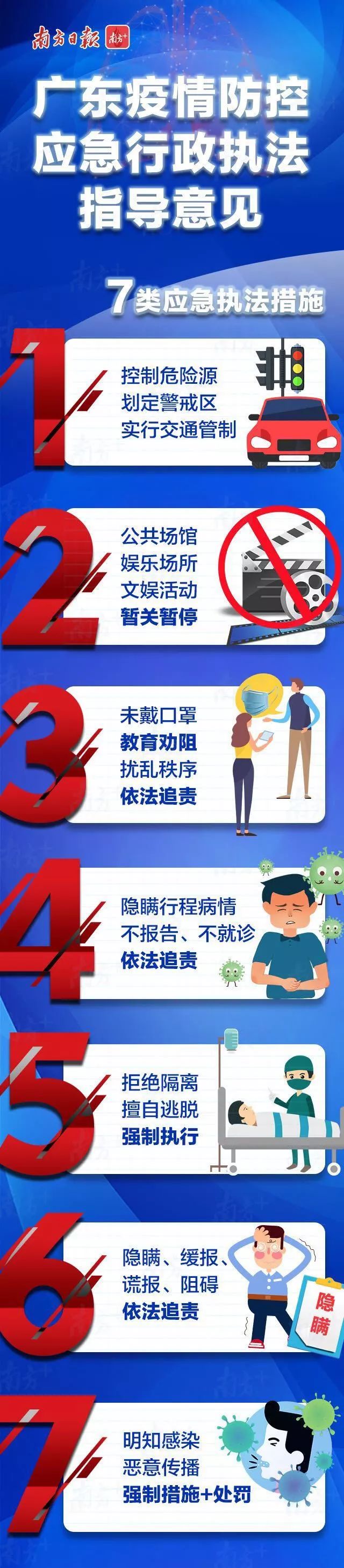 瞞報(bào)“接觸史” 依法追究責(zé)任 1月23日,廣東啟動(dòng)了突發(fā)公共衛(wèi)生事件一級(jí)響應(yīng)?!兑庖姟访鞔_了各地各部門可依法采取的七類應(yīng)急執(zhí)法措施: 一、迅速控制危險(xiǎn)源,標(biāo)明危險(xiǎn)區(qū)域,封鎖危險(xiǎn)場(chǎng)所,劃定警戒區(qū),實(shí)行交通管制以及其他控制措施。 二、禁止或者限制使用有關(guān)設(shè)備、設(shè)施,關(guān)閉或者限制使用有關(guān)場(chǎng)所,中止人員密集的活動(dòng),或可能導(dǎo)致危害擴(kuò)大的生產(chǎn)經(jīng)營(yíng)活動(dòng)以及采取其他保護(hù)措施。全省各地文化館、圖書館等暫停對(duì)外開放,娛樂場(chǎng)所、網(wǎng)吧等暫停營(yíng)業(yè),暫停所有星級(jí)酒店舉辦的一切大型會(huì)展和文娛活動(dòng)。 三、進(jìn)入賓館、體育場(chǎng)(館)、候車(機(jī)、船)室、公共交通工具、商店等公共場(chǎng)所,未佩戴口罩的人員,身體健康的,以教育、勸阻為主;不聽勸阻或者有感染癥狀的,依法處理。構(gòu)成犯罪的,依法追究刑事責(zé)任。 四、瞞報(bào)疫情重點(diǎn)地區(qū)旅行史、居住史,或者明知自己可能或者應(yīng)當(dāng)屬于新型冠狀病毒感染的肺炎疑似病人、確診病人、病原攜帶者或者上述三種人的密切接觸者,不主動(dòng)向單位、社區(qū)報(bào)告,不服從單位、社區(qū)健康監(jiān)測(cè)管理,不到定點(diǎn)醫(yī)療機(jī)構(gòu)就診,引起傳染病傳播或者有傳播嚴(yán)重風(fēng)險(xiǎn)的,依法追究責(zé)任。構(gòu)成犯罪的,依法追究刑事責(zé)任。 五、對(duì)需要接受隔離治療、醫(yī)學(xué)觀察措施的病人、疑似病人和傳染病病人密切接觸者,在衛(wèi)生健康行政主管部門或者有關(guān)機(jī)構(gòu)采取醫(yī)學(xué)措施時(shí)應(yīng)當(dāng)予以配合;拒絕配合、拒絕隔離治療或者隔離期未滿擅自脫離隔離治療的,由公安機(jī)關(guān)依法協(xié)助強(qiáng)制執(zhí)行。 六、單位或者個(gè)人未按規(guī)定履行報(bào)告職責(zé),隱瞞、緩報(bào)或者謊報(bào),阻礙突發(fā)事件應(yīng)急處理工作人員執(zhí)行職務(wù),拒絕衛(wèi)生健康行政主管部門或者其他有關(guān)部門指定的專業(yè)技術(shù)機(jī)構(gòu)進(jìn)入突發(fā)事件現(xiàn)場(chǎng),或者不配合調(diào)查、采樣、技術(shù)分析和檢驗(yàn)的,將依法追責(zé)。構(gòu)成犯罪的,依法追究刑事責(zé)任。 七、對(duì)明知自己感染新型冠狀病毒,又惡意傳播病毒、污染公共場(chǎng)所的人員,依法采取強(qiáng)制措施并給予處罰。 擾亂市場(chǎng)秩序 從嚴(yán)從快查處 疫情期間,廣東相關(guān)執(zhí)法部門已先后通報(bào)了一批違法案例。此次出臺(tái)的《意見》也明確了九類重點(diǎn)執(zhí)法領(lǐng)域: 一 嚴(yán)防疫情擴(kuò)散 各單位、社區(qū)應(yīng)當(dāng)按照防控規(guī)定,采取健康監(jiān)測(cè)管理等聯(lián)防聯(lián)控措施。單位干部、職工、社區(qū)居民等有疫情重點(diǎn)地區(qū)旅行史、居住史或者存在疑似感染癥狀的,應(yīng)當(dāng)及時(shí)報(bào)告有關(guān)情況。單位、社區(qū)應(yīng)當(dāng)對(duì)上述人員采取隔離、送醫(yī)等措施,并向當(dāng)?shù)丶部夭块T和定點(diǎn)醫(yī)療機(jī)構(gòu)報(bào)告。 二 嚴(yán)懲侵犯醫(yī)務(wù)人員人身安全或者人格尊嚴(yán)的行為 對(duì)在醫(yī)療機(jī)構(gòu)聚眾滋事、侵害患者和醫(yī)務(wù)人員人身安全、限制醫(yī)務(wù)人員人身自由、辱罵或者恐嚇醫(yī)務(wù)人員的,依法采取一切必要措施果斷制止,追究責(zé)任。構(gòu)成犯罪的,依法追究刑事責(zé)任。 三 嚴(yán)格追究冒用他人身份入住旅館的行為 在疫情防控期間違反規(guī)定,依法從重處罰。 四 處置散布虛假信息等行為 編造并傳播有關(guān)新型冠狀病毒疫情事態(tài)發(fā)展或者應(yīng)急處置工作的虛假信息,或者明知是虛假信息而傳播的,責(zé)令改正,給予警告;造成嚴(yán)重后果的,依法暫停其業(yè)務(wù)活動(dòng)或吊銷其執(zhí)業(yè)許可證;負(fù)有直接責(zé)任的人員是國(guó)家工作人員的,還應(yīng)當(dāng)對(duì)其依法給予處分。 五 嚴(yán)懲囤積居奇、哄抬物價(jià)、制假售假等擾亂市場(chǎng)秩序的行為 要重點(diǎn)檢查有關(guān)醫(yī)療用品、藥品的價(jià)格執(zhí)行情況,從嚴(yán)從快查處有關(guān)違法行為。 六 查處擅自復(fù)工、開學(xué)的行為 違反規(guī)定的,由公安機(jī)關(guān)依法給予處罰。 七 查處非法泄露個(gè)人信息的行為 對(duì)故意泄露傳染病病人、病原攜帶者、疑似傳染病病人、密切接觸者涉及個(gè)人隱私的有關(guān)信息、資料,依法給予處罰。 八 嚴(yán)禁野生動(dòng)物交易 全國(guó)疫情解除期間,禁止野生動(dòng)物交易活動(dòng)。各地、各部門應(yīng)當(dāng)加強(qiáng)檢查,違反規(guī)定的嚴(yán)肅查處,對(duì)經(jīng)營(yíng)者、經(jīng)營(yíng)場(chǎng)所依法予以停業(yè)整頓、查封;構(gòu)成犯罪的,依法追究刑事責(zé)任。 九 依法保障勞動(dòng)者合法權(quán)益 對(duì)新型冠狀病毒感染的肺炎患者、疑似病人、密切接觸者,在其隔離治療期間或者醫(yī)學(xué)觀察期間,以及因政府實(shí)施隔離措施或者采取其他緊急措施導(dǎo)致不能提供正常勞動(dòng)的企業(yè