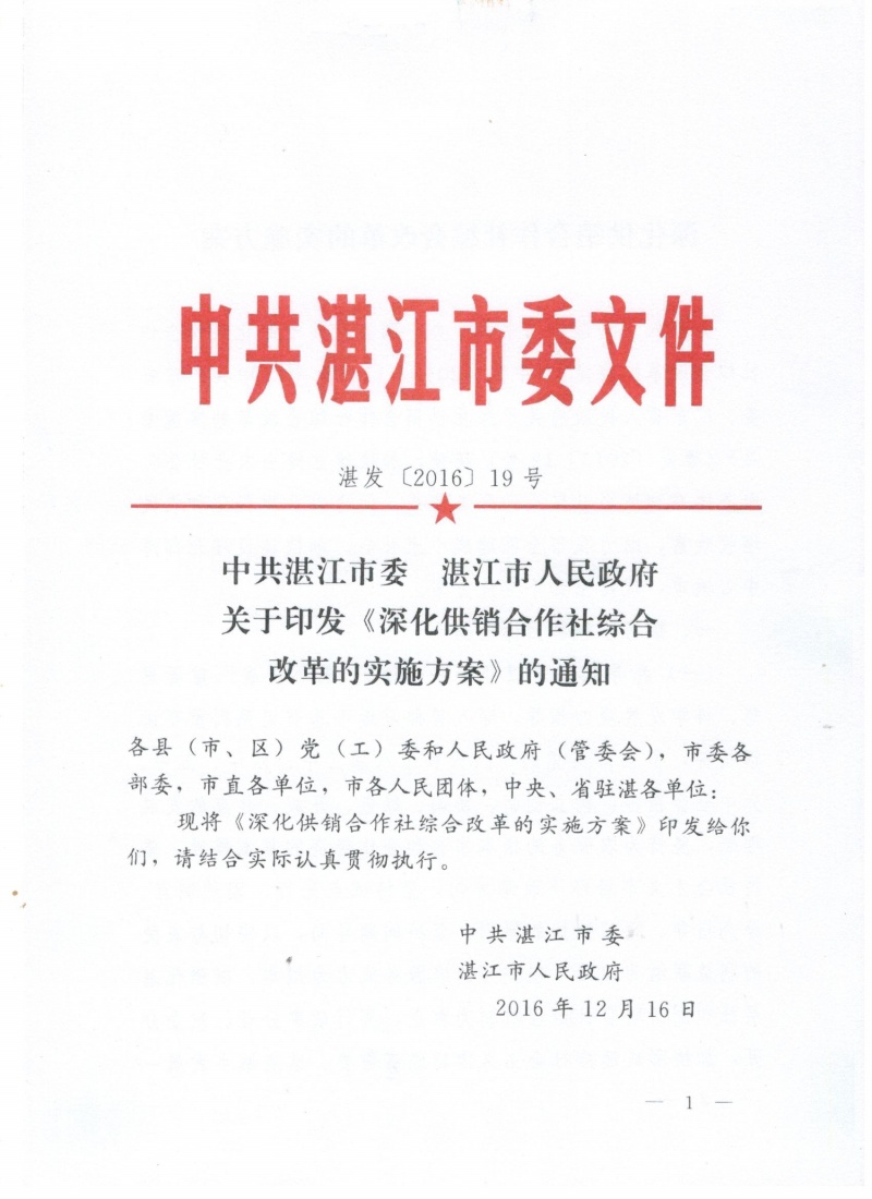 ??? 2016年12月16日,中共湛江市委? 湛江市人民政府湛發(fā)〔2016〕19號(hào)印發(fā)《深化供銷合作社綜合改革的實(shí)施意見(jiàn)方案》。這是深入貫徹落實(shí)《中共中央 國(guó)務(wù)院關(guān)于深化供銷合作社綜合改革的決定》(中發(fā)〔2015〕11號(hào))和《中共廣東省委 廣東省人民政府關(guān)于深化供銷合作社綜合改革的實(shí)施意見(jiàn)》(粵發(fā)〔2015〕12號(hào))精神,加快建立健全農(nóng)業(yè)社會(huì)化服務(wù)體系和城鄉(xiāng)社區(qū)生活服務(wù)體系,促進(jìn)農(nóng)業(yè)現(xiàn)代化和農(nóng)民增收致富,促進(jìn)我市供銷合作社發(fā)展改革的重大部署。