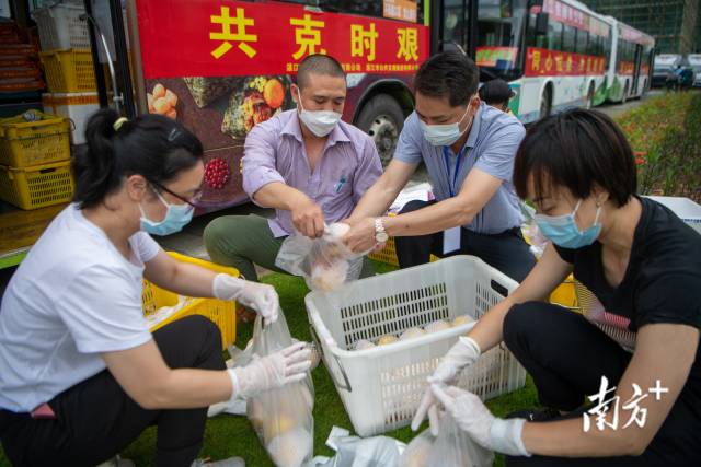 蘋果、雞蛋、蔬菜、臘腸、土豬肉……5月13日,在湛江坡頭區(qū)南苑小區(qū),社區(qū)居民發(fā)現(xiàn)一部“特殊”的公交車,工作人員搬下來(lái)一箱箱新鮮的瓜果蔬菜。