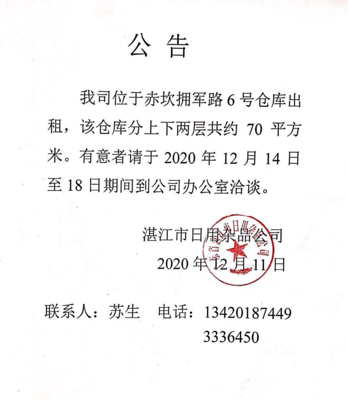 湛江市日用雜品公司倉(cāng)庫(kù)出租公告