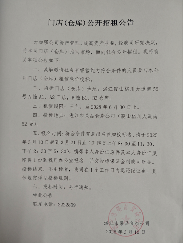 門店(倉庫)公開招租公告
