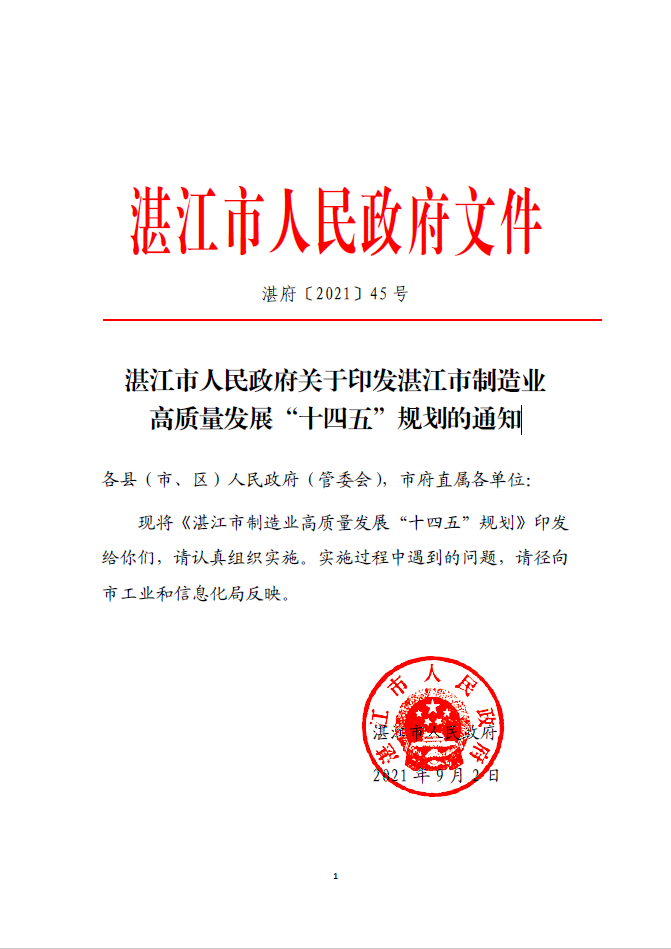 湛江市人民政府關(guān)于印發(fā)湛江市制造業(yè) 高質(zhì)量發(fā)展“十四五”規(guī)劃的通知