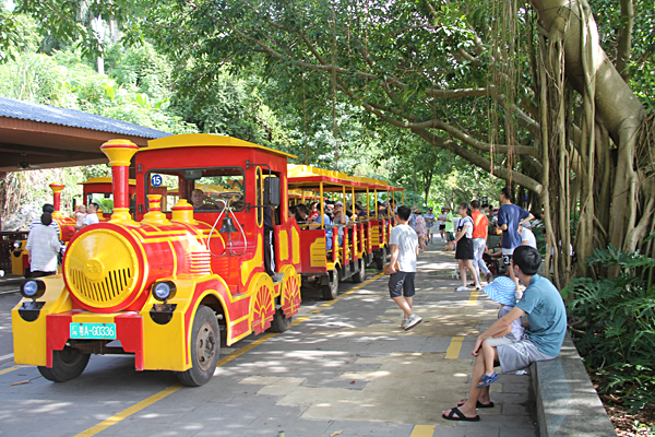 游客乘坐湖光巖景區(qū)環(huán)湖小火車觀光游覽