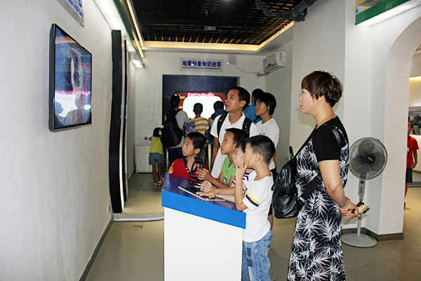 小朋友們在湖光巖地震館參與趣味小游戲體驗的情景