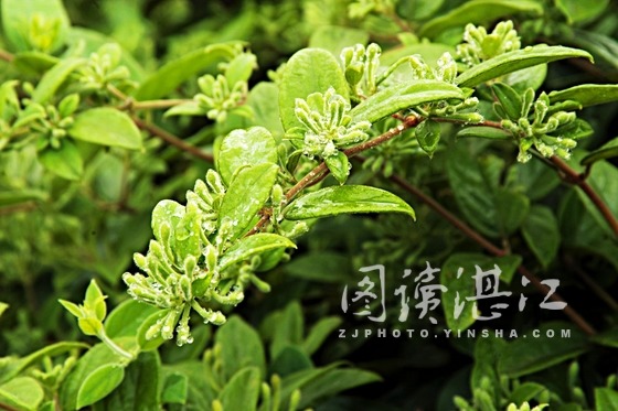 山銀花,學名華南忍冬,湛江道地藥材之一,花、葉、枝、根均可入藥,尤以花蕾最佳。具有較強清熱解毒、涼散祛熱功能, 主要有效成分:綠原酸、異綠原酸、雙花醇、芳樟醇;并含木犀草素、番木鱉甙、肌醇、揮發(fā)油等,應(yīng)用面較廣。高純度綠原酸被譽為“植物黃金”,進口價格高達415元/克。但山銀花的綠化作用往往被忽視了,據(jù)研究基地負責人介紹,山銀花植物對氟化氫、二氧化硫等有毒氣體有較強的抵抗力,能增加空氣中的氧氣負離子,凈化空氣;且山銀花為藤科植物,易引植成為造型觀賞花卉。在湛江重視綠化環(huán)境的今天,山銀花是不能忽視的一種特產(chǎn)綠化植物。