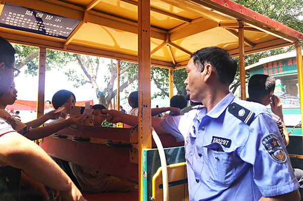 環(huán)湖車工作人員忙而不亂確保游客乘車安全