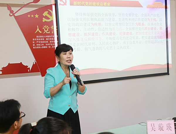 吳璇瑛同志作《“不忘初心、牢記使命”,推動基層黨建高質量發(fā)展》專題輔導,對黨建基礎知識開展了深入淺出的講解,重點闡述了黨建工作的職責定位、黨組織設置、基層黨組織換屆選舉、發(fā)展黨員工作和黨支部組織生活會等基礎黨建工作。培訓從基本概念和基本要求著手,聚焦黨的基本理論知識和黨建工作規(guī)范,旨在切實提高基層黨務工作者工作能力和工作水平,進一步增強黨務工作者的責任感和使命感,做到主動作為、勇于擔當,努力提高基層黨建工作水平。