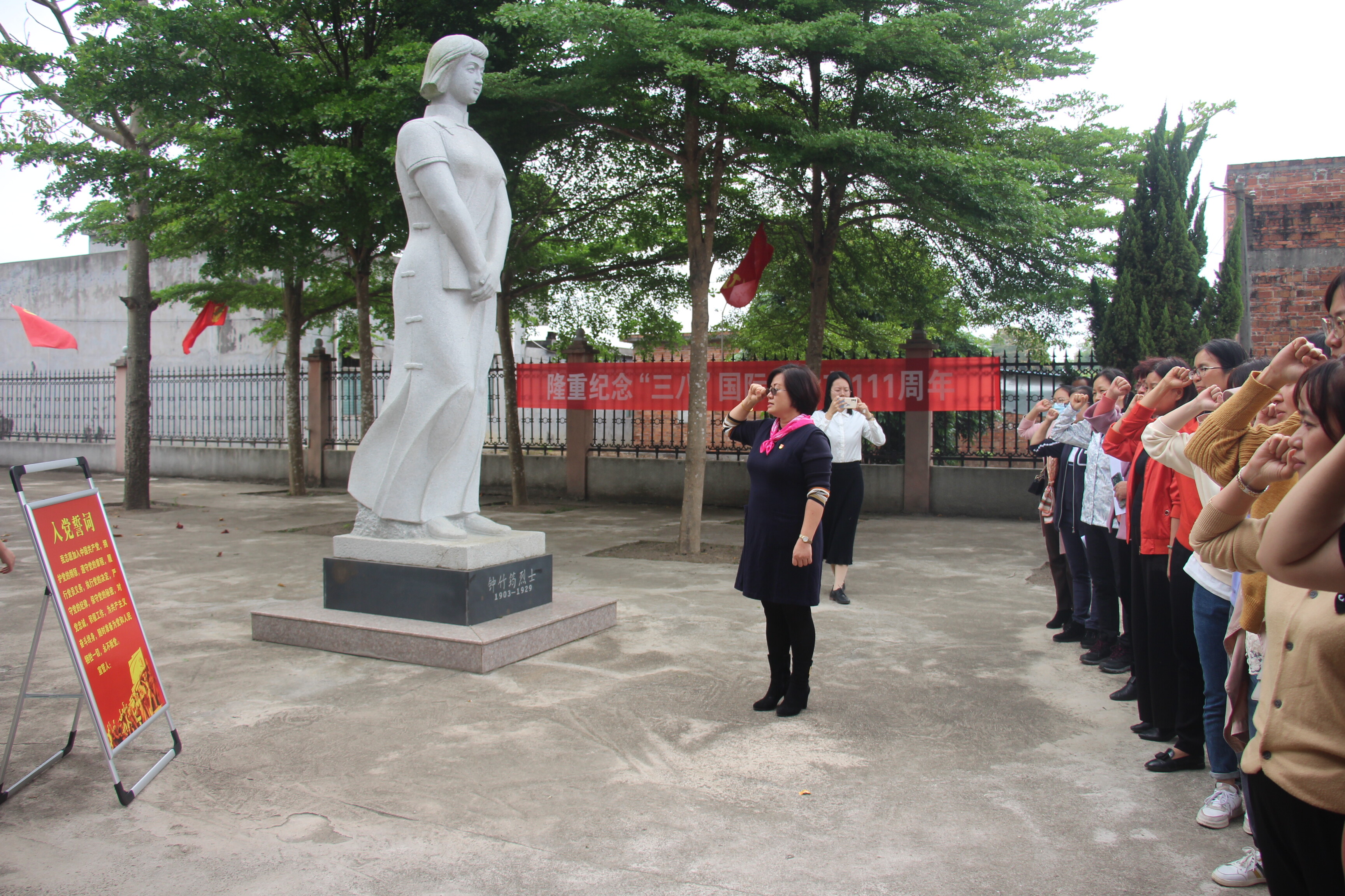 (圖為婦女黨員在烈士雕像前重溫入黨誓詞)