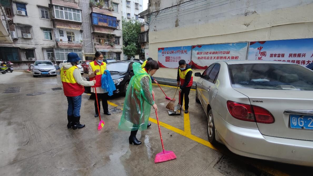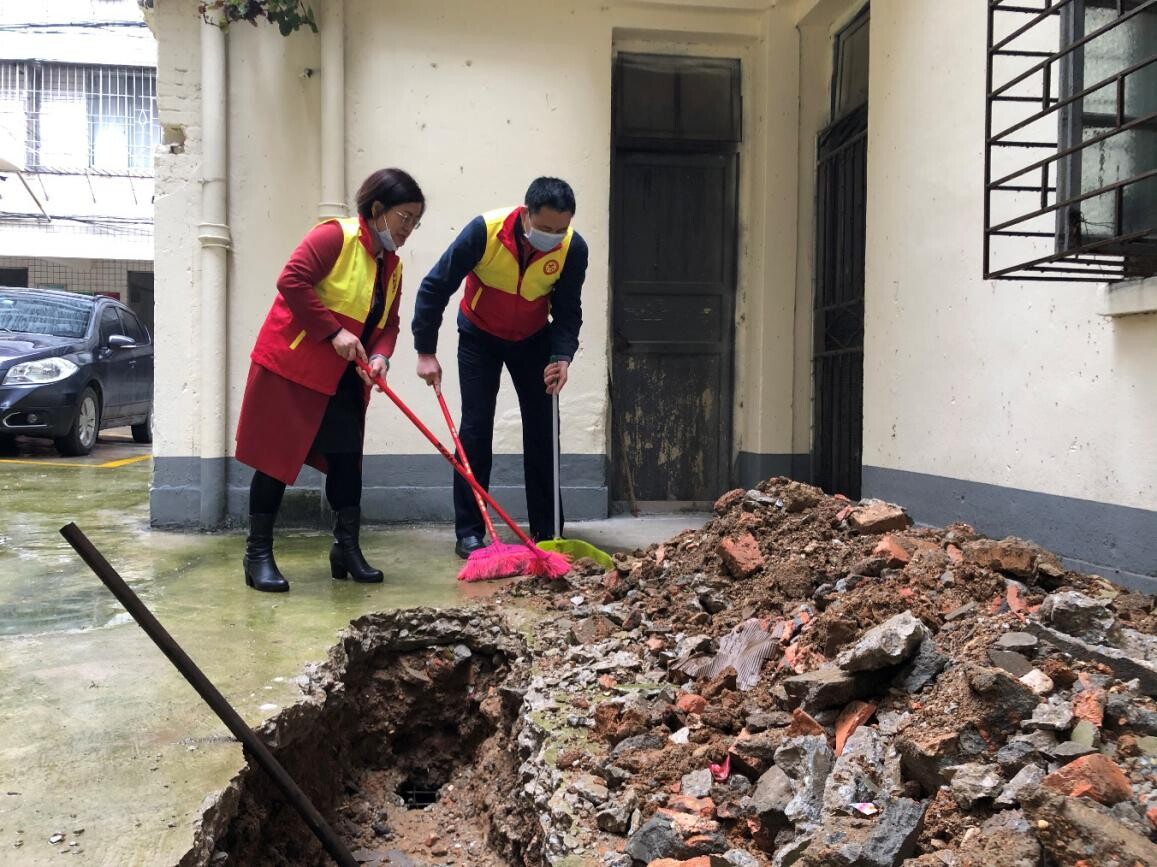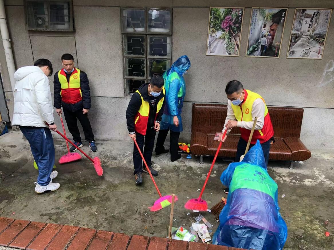 活動期間,天空下著蒙蒙細雨,道路濕滑,但志愿者們克服雨天障礙,發(fā)揮不怕苦、不怕臟的戰(zhàn)斗熱情,冒雨對社區(qū)及周邊環(huán)境進行全面清理整治。大家進行分工合作,拿起掃把、抹布、鏟子、消毒液等工具,有的負責樓道清理,爬上爬下打掃樓道遺留的垃圾;有的鏟除過道小廣告,協(xié)助社區(qū)網(wǎng)格員檢查核實消防設施。趙一方總工程師負責地面衛(wèi)生,帶領大家從小區(qū)外部到樓宇內(nèi)部,從垃圾桶清理到角落進行全方位清潔消毒,不落下一個死角;為了清除頑固的青苔污跡,第三黨支部書記柯福賓還自掏腰包買來鋼絲刷進行清刷。