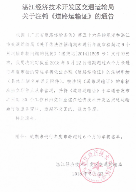 湛江經(jīng)濟(jì)技術(shù)開發(fā)區(qū)交通運(yùn)輸局關(guān)于注銷《道路運(yùn)輸證》的通告