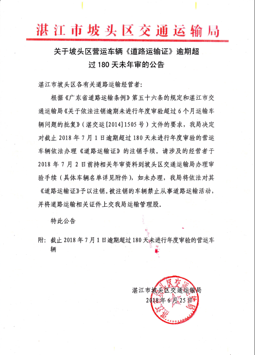 關(guān)于坡頭區(qū)營運車輛《道路運輸證》逾期超過180天未年審的公告