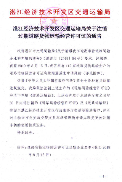 湛江經(jīng)濟(jì)技術(shù)開發(fā)區(qū)交通運(yùn)輸局關(guān)于注銷過期道路貨物運(yùn)輸經(jīng)營許可證的通告