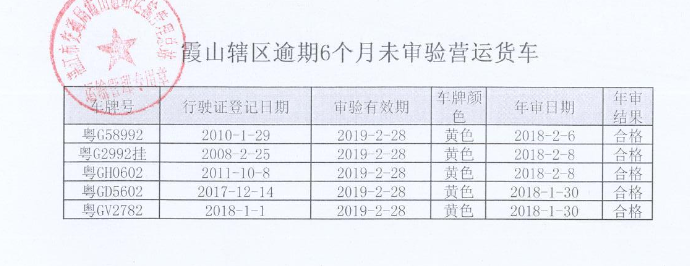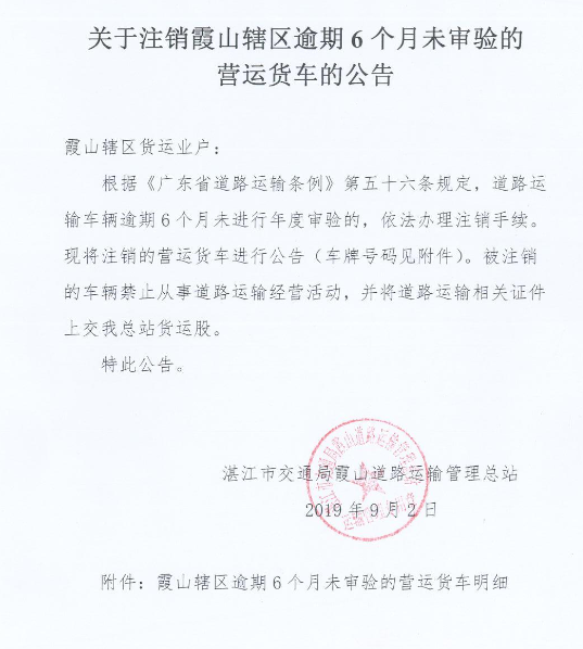 關(guān)于注銷(xiāo)霞山轄區(qū)逾期6個(gè)月未審驗(yàn)的營(yíng)運(yùn)貨車(chē)的公告(9月)