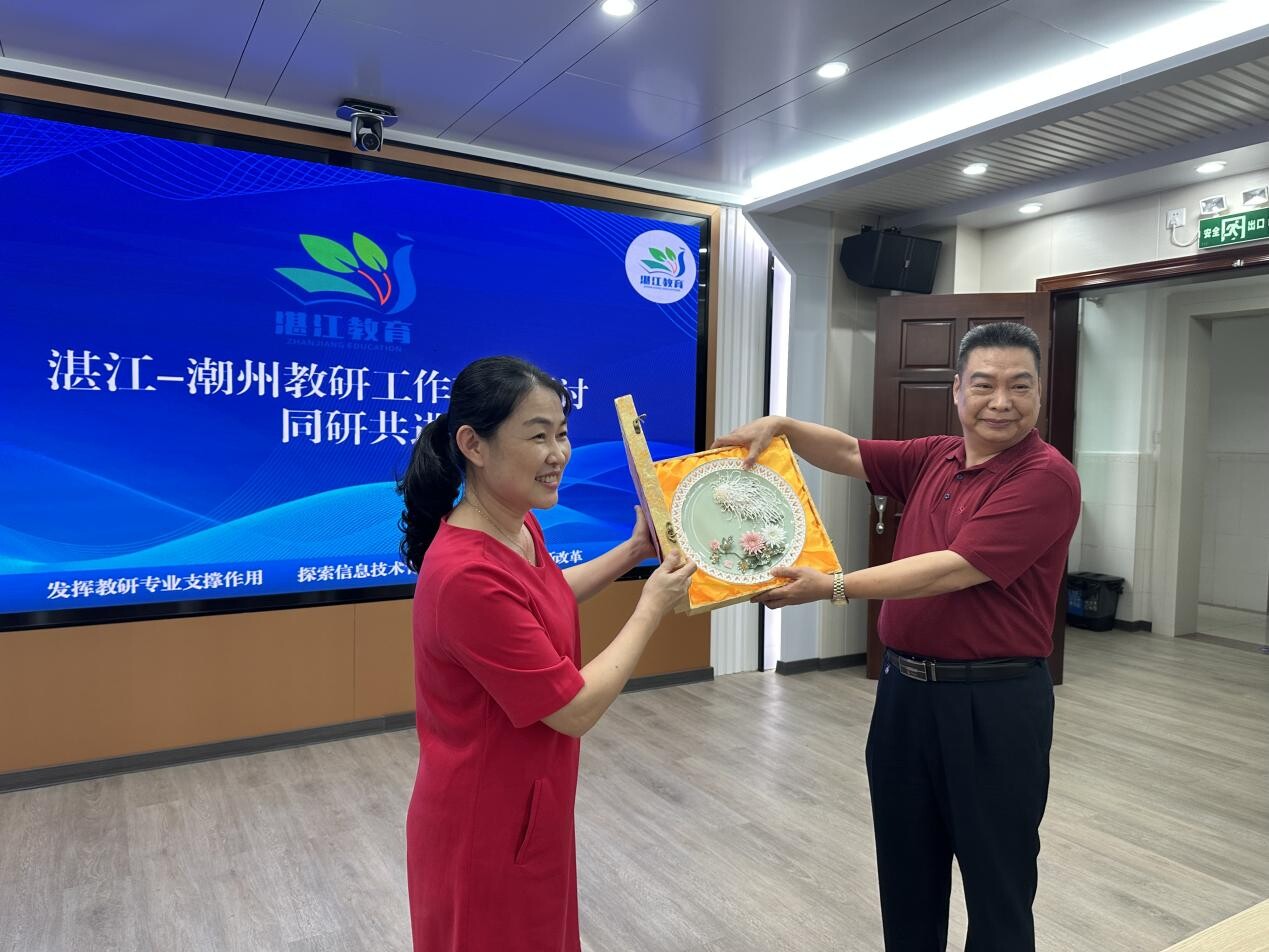活動最后,潮州市教育研究與教師發(fā)展中心林躍文主任為湛江市教育局贈送寓意湛潮情誼的紀(jì)念品。