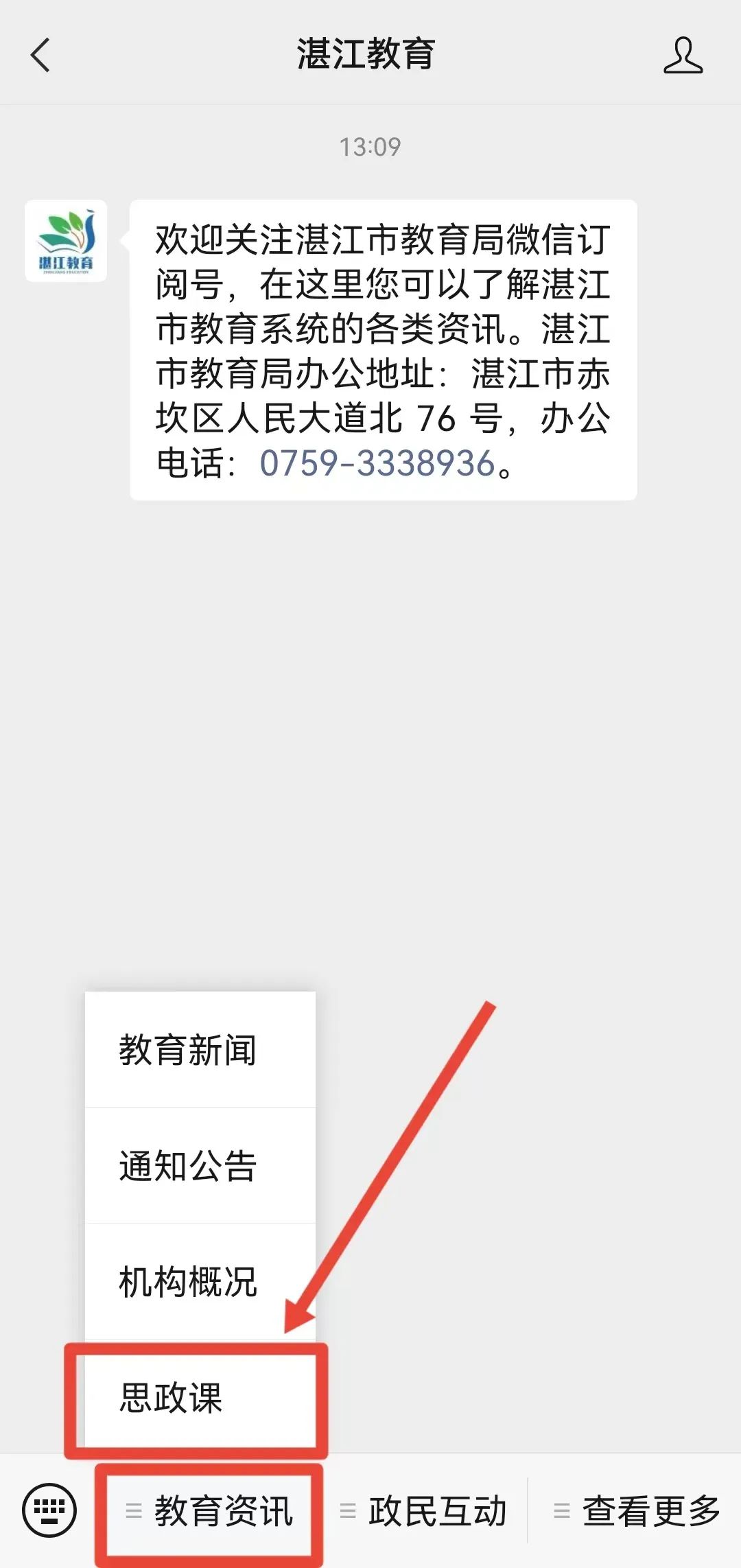 2.關(guān)注“湛江教育”微信公眾號,點擊菜單欄“教育資訊”——“思政課”可隨時收看回放。
