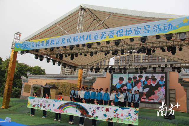“我要一步一步往上爬,在最高點(diǎn)乘著葉片往前飛,任風(fēng)吹干流過(guò)的淚和汗,總有一天我有屬于我的天……”隨著清澈空靈的童音響起,臺(tái)下觀眾瞬間安靜,只余清揚(yáng)的歌聲和手機(jī)拍攝的聲音,這首由遂溪縣特殊教育學(xué)校兒童與遂溪縣職業(yè)技術(shù)學(xué)校學(xué)生演唱的歌曲《蝸?!肥撬煜h教育系統(tǒng)為第十八個(gè)世界孤獨(dú)癥關(guān)注日共同彩排練習(xí)的曲目,也是政府指導(dǎo)、社會(huì)出力、普通學(xué)校與特殊學(xué)?!叭趷?ài)同行”的實(shí)際行動(dòng)。