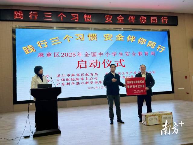 活動(dòng)儀式上,麻章四小學(xué)生代表分享了“養(yǎng)成好習(xí)慣 安全伴成長(zhǎng)”小故事,學(xué)校代表分享了加強(qiáng)校園安全教育培養(yǎng)學(xué)生三個(gè)好習(xí)慣的經(jīng)驗(yàn)做法。人保財(cái)險(xiǎn)麻章支公司潘凰慧經(jīng)理和廣東新華發(fā)行集團(tuán)粵西區(qū)域管理中心總經(jīng)理兼湛江新華書店總經(jīng)理陳錫星分別發(fā)言并代表公司向區(qū)教育系統(tǒng)贈(zèng)送校園安全宣傳教育用品一批和圖書2000冊(cè)。