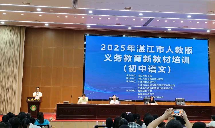 秋風(fēng)送爽,學(xué)意正濃。8月27日,2025年湛江市人教版義務(wù)教育新教材培訓(xùn)(初中語(yǔ)文)在遂溪縣大成中學(xué)隆重舉行。本次培訓(xùn)由湛江市教育局主辦,湛江市教育局教學(xué)研究室組織,廣東教材出版中心、廣東南方出版?zhèn)髅浇滩慕?jīng)營(yíng)有限公司、廣東省出版集團(tuán)數(shù)字出版有限公司承辦,遂溪縣教育局、遂溪縣大成中學(xué)協(xié)辦。本次培訓(xùn)活動(dòng)以線(xiàn)上線(xiàn)下相結(jié)合的形式進(jìn)行,其中,約500名老師參加線(xiàn)下培訓(xùn),4000多名老師在線(xiàn)上觀看直播。培訓(xùn)活動(dòng)由遂溪縣初中語(yǔ)文教研員樊家銳老師主持。