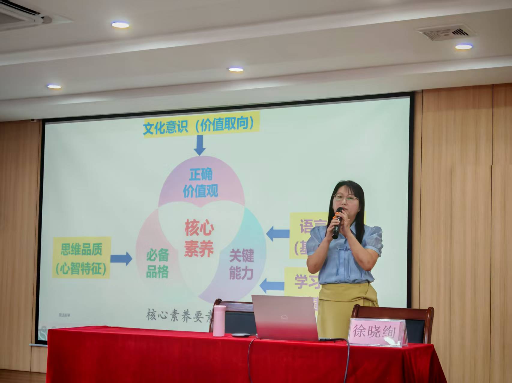 本次活動特邀人教社培訓專家、廣東省基礎教育教研體系建設初中英語學科-教研項目(汕頭)負責人、汕頭市教師發(fā)展中心初中英語教研員徐曉絢老師進行專題講座。講座中,徐曉絢老師通過與現(xiàn)場教師互動研討的形式,深入剖析英語新課程標準課程目標中核心素養(yǎng)的內涵。她明確指出,核心素養(yǎng)由正確價值觀、關鍵能力與必備品格三部分構成,既是對傳統(tǒng)教學體系的重要補充與完善,更是新時代教育的核心導向 —— 如今的教育需聚焦培養(yǎng)能為祖國發(fā)展建設貢獻力量的人才,為現(xiàn)場教師理解核心素養(yǎng)的實踐意義提供了清晰指引。