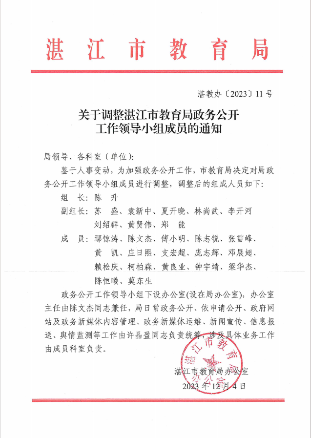 關(guān)于調(diào)整湛江市教育局政務(wù)公開工作領(lǐng)導(dǎo)小組成員的通知(湛教辦〔2023〕11號).pdf