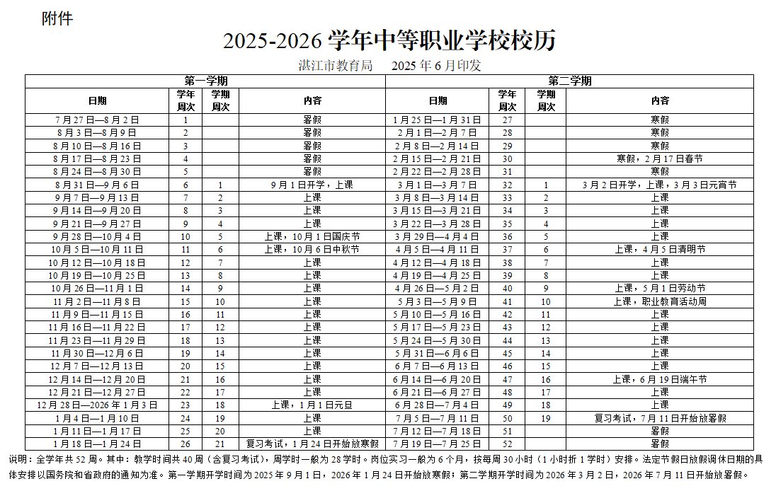 湛江市教育局關(guān)于印發(fā)2025-2026學(xué)年中等職業(yè)學(xué)校校歷的通知