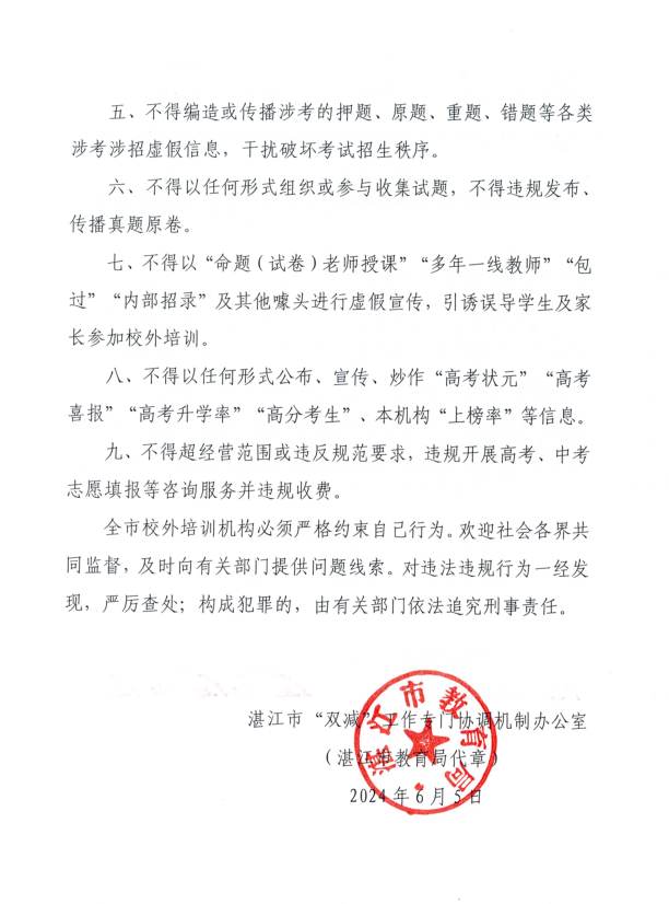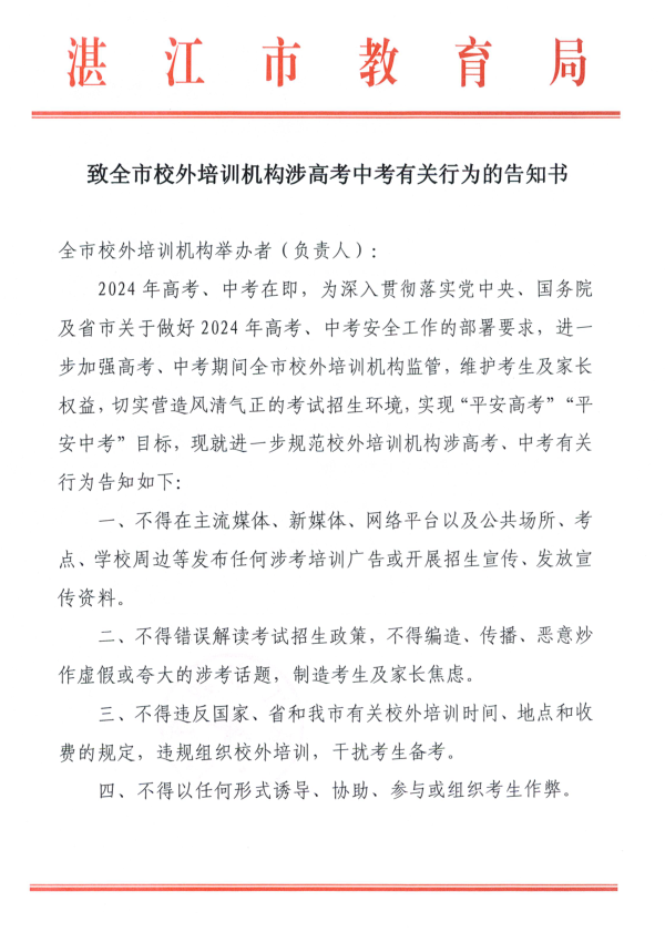 致全市校外培訓(xùn)機(jī)構(gòu)涉高考中考有關(guān)行為的告知書
