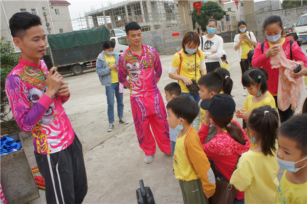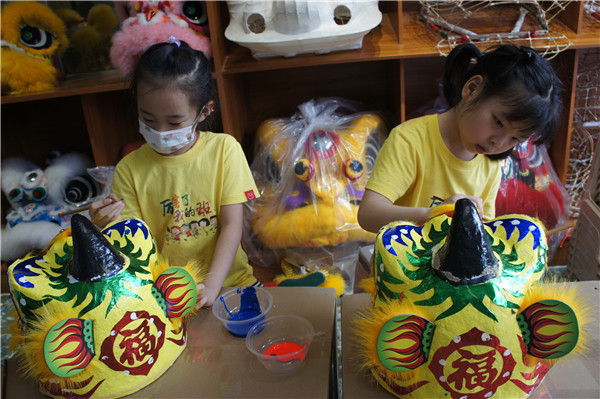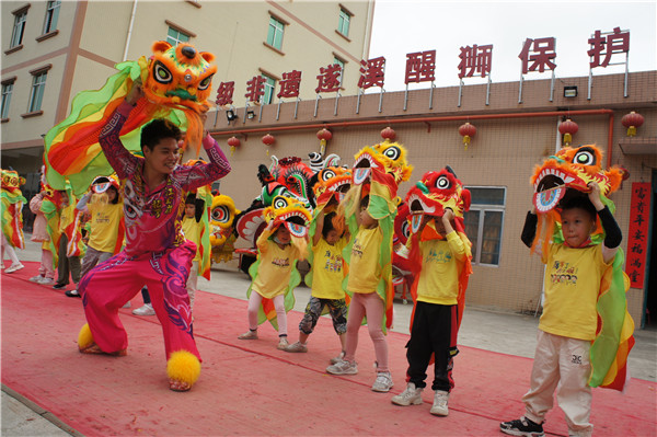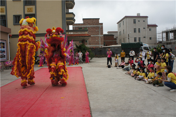 活動(dòng)中,孩子們?cè)诜沁z傳承人李祖杰哥哥的帶領(lǐng)下,聆聽醒獅的傳說(shuō),參觀了解醒獅頭制作工藝,觀看龍灣醒獅團(tuán)的舞獅表演,學(xué)習(xí)、體驗(yàn)舞獅和裝飾獅子頭。