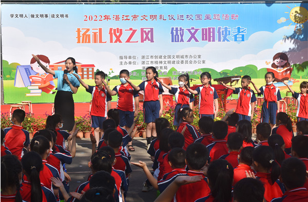 6月24日,“揚禮儀之風 做文明使者”2022年湛江市文明禮儀進校園活動在湛江市第二十五小學舉行(如圖,記者 殷翊展 攝)?;顒訉⑽拿鞫Y儀帶進校園,通過喜聞樂見的形式,讓學生們在有趣的體驗活動中知禮儀、習禮儀,提高學生的文明素養(yǎng),讓更多學生一起參與文明創(chuàng)建,爭做文明的傳播者、踐行者。