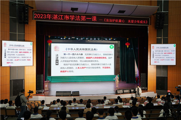 3月6日,湛江市學(xué)法第一課——“法治護(hù)航童心 關(guān)愛少年成長”活動在湛江第一中學(xué)舉辦(如圖,記者劉冀城 攝)?;顒硬扇【€上線下相結(jié)合的方式開展,湛江市各中小學(xué)校近萬名師生、法治副校長通過直播同步參與。