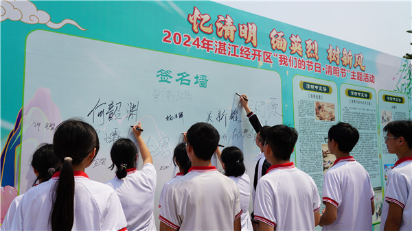活動現(xiàn)場,全體人員肅立默哀,表達對先烈的敬意。師生們紛紛在簽名墻上留言寄語,寄托哀思,傳遞愛國情懷。(湛江日報 記者陳荔雅 通訊員鄭小嬌)