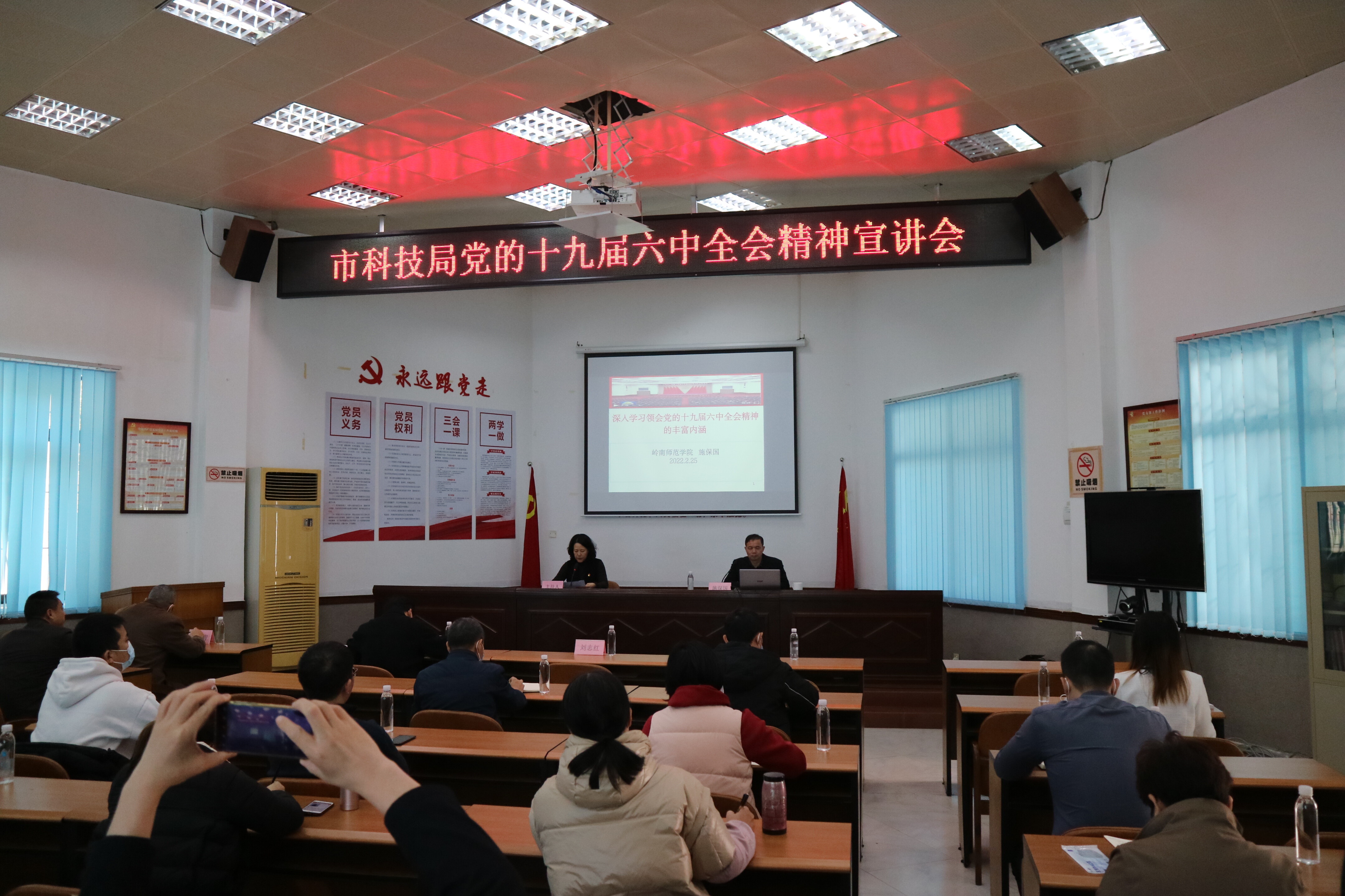 2月25日,市科技局為全面深入學(xué)習(xí)領(lǐng)會黨的十九屆六中全會精神的豐富內(nèi)涵與核心要義,邀請了湛江市委理論宣講員,嶺南師范學(xué)院馬克思主義學(xué)院副院長、教授施保國同志為大家做黨的十九屆六中全會精神的宣講輔導(dǎo)。會議由市科技局黨組成員、局機關(guān)黨委副書記劉志紅主持,局全體干部職工及下屬單位負(fù)責(zé)人參加會議。