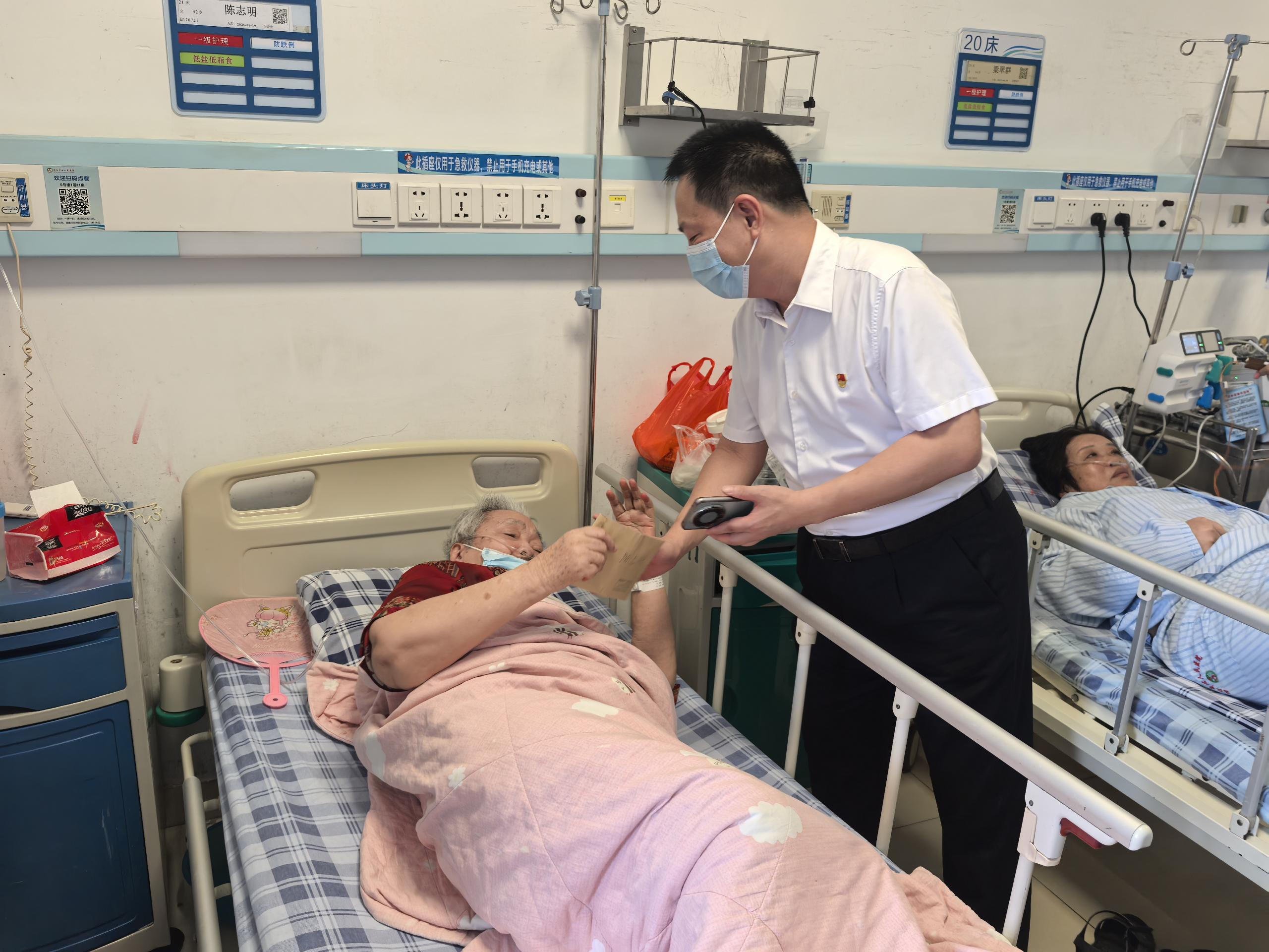 圖為局黨組書記、局長江強(qiáng)同志到湛江中心人民醫(yī)院病房看望陳志明同志