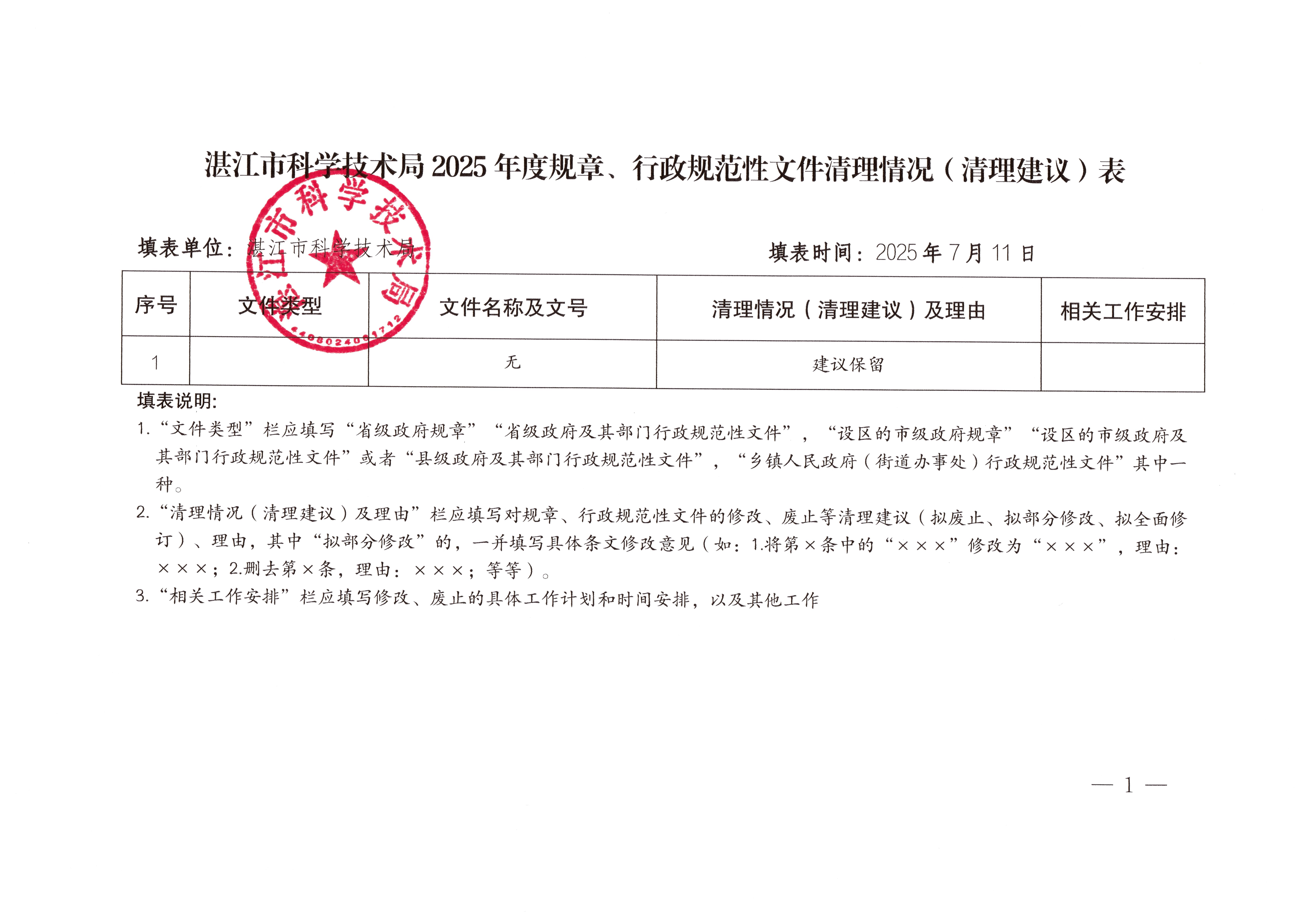 湛江市科學技術局2025年度規(guī)章、行政規(guī)范性文件清理情況(清理建議)