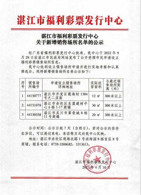 湛江市福利彩票發(fā)行中心關(guān)于新增銷售場所名單的公示(4.10)