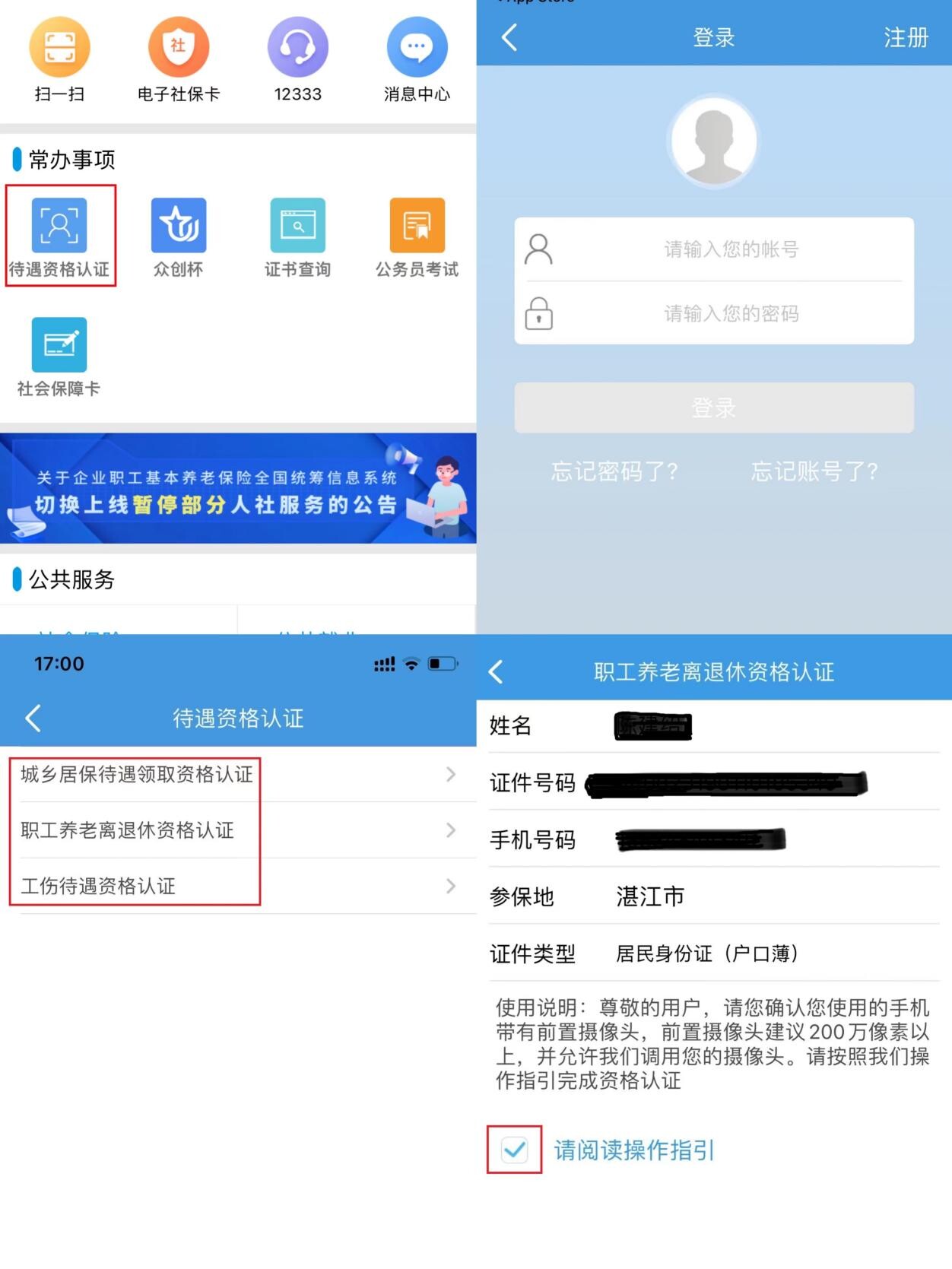 微信搜索“粵省事”小程序→選擇城市“湛江”→下滑選擇【社保】服務(wù)→【養(yǎng)老資格認(rèn)證】→根據(jù)人員身份選擇:企業(yè)職工(含靈活就業(yè))退休人員點(diǎn)擊【企業(yè)職工領(lǐng)取養(yǎng)老保險(xiǎn)待遇資格認(rèn)證】,城鄉(xiāng)居民退休人員點(diǎn)擊【(城鄉(xiāng)居民)養(yǎng)老待遇領(lǐng)取資格認(rèn)證】→勾選同意條款后點(diǎn)擊【開始辦理】→選擇“本人辦理”或“為他人辦理”后點(diǎn)擊【下一步】,根據(jù)頁面要求進(jìn)行身份校驗(yàn)及人臉識(shí)別。