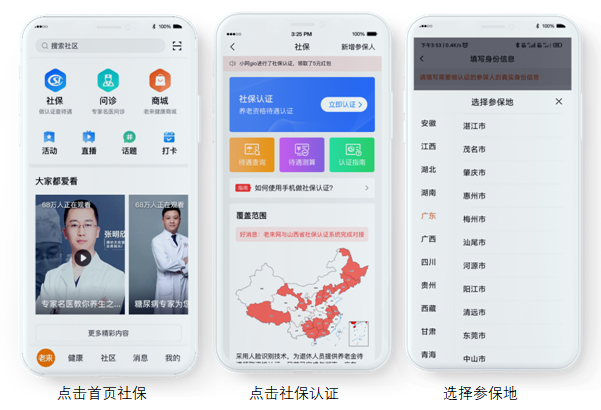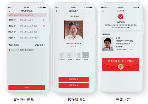 2、下載“老來“APP→首頁社?!绫UJ(rèn)證→選擇參保地→填寫身份信息→選擇攝像頭→進(jìn)行人臉識(shí)別→完成認(rèn)證