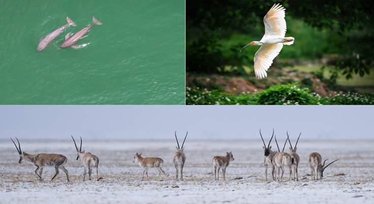 5月11日攝);右上圖為陜西省漢中市洋縣朱鹮生態(tài)園內(nèi)的朱鹮(新華社記者劉瀟5月13日攝);下圖為藏羚羊在三江源可可西里地區(qū)活動(dòng)(新華社記者吳剛4月20日攝)。新華社發(fā)