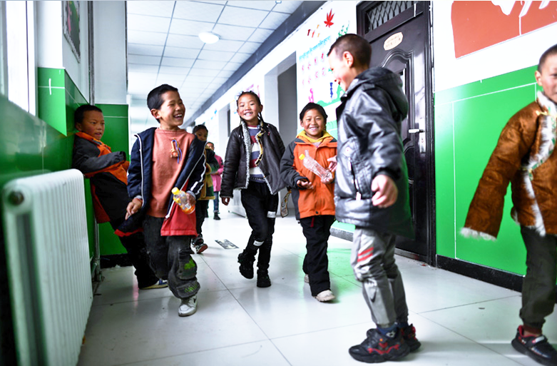 2021年3月26日,青?,敹嗫h民族寄宿制中學(xué)二年級的學(xué)生在課間玩耍。該校目前采用清潔取暖方式,學(xué)生的學(xué)習(xí)和生活環(huán)境大為改善。新華社記者 張宏祥 攝