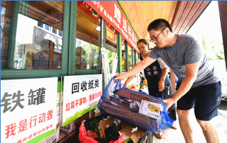 2020年8月25日,居民將生活垃圾送到??谑忻捞m區(qū)和平南街道愛心環(huán)保屋,用垃圾換取紙巾、肥皂等生活用品。新華社記者 郭程 攝