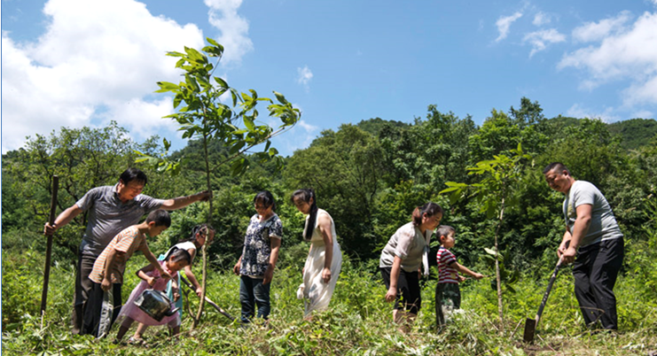 姚祖元(右一)與家人一起種樹(2019年7月13日攝)。在秦嶺深處的陜西省漢中市留壩縣火燒店鎮(zhèn),姚家五代人歷時(shí)70年深耕秦嶺的故事在當(dāng)?shù)丶矣鲬魰?,傳為佳話。新華社記者 陶明 攝
