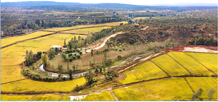 2020年9月26日拍攝的陜西省靖邊縣黃蒿界鎮(zhèn)馬季溝村稻田(無人機(jī)照片)。近年來,靖邊縣實(shí)施了“三北”防護(hù)林、退耕還林、流域治理等生態(tài)建設(shè)工程,北部沙漠區(qū)裸露明沙完全消失,中部農(nóng)田林網(wǎng)蔚然成蔭,南部山區(qū)夏季綠色滿山。新華社記者 陶明 攝