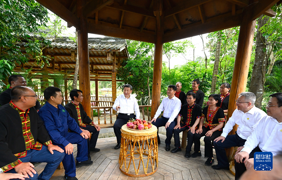 4月10日至13日,中共中央總書記、國(guó)家主席、中央軍委主席習(xí)近平在海南考察。這是11日下午,習(xí)近平在五指山市水滿鄉(xiāng)毛納村,同黎族村民王柏和一家親切交談。新華社記者謝環(huán)馳 攝