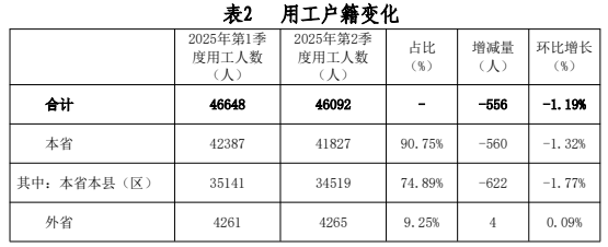 ?。ǘ┯霉艏?025年第2季度本省用工人數(shù)41827人,較2025年第1季度42387人減少560人,環(huán)比下降1.32%。其中:本省本縣(區(qū))人數(shù)34519人,較2025年第1季度35141人減少622人,環(huán)比下降1.77%。外省人數(shù)4265人,較2025年第1季度4261人增加4人,環(huán)比增長0.09%。企業(yè)用工按戶籍分,用工以本省戶籍人員為主,占90.75%,其中本省本縣(區(qū))占74.89%。