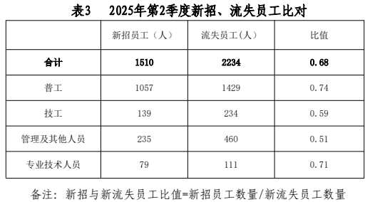 ?。ㄈ┯霉し€(wěn)定性:2025年第2季度,350家監(jiān)測樣本企業(yè)新招員工1510人,流失2234人,比值為0.68。其中:普工新招1057人,流失1429人,比值為0.74 ;技工新招139人,流失234人,比值為0.59;管理及其他人員新招235人,流失460人,比值為0.51;專業(yè)技術(shù)人員新招79人,流失111人,比值為0.71。從用工穩(wěn)定性總體上看,本季度流失人數(shù)高于新招人數(shù)。(見附表3)