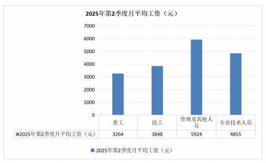 ?。ㄋ模┬匠甏觯?025年第2季度,普工月平均工資3264元,技工月平均工資3848元,管理及其他人員月平均工資5924元,專業(yè)技術(shù)人員月平均工資4855元。從薪酬水平情況看,薪酬最高的為管理及其他人員,薪酬最低的為普工。