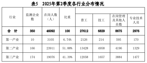 (五)產(chǎn)業(yè)情況:2025年第2季度監(jiān)測的350家企業(yè),屬于第一產(chǎn)業(yè)有10家,在崗人數(shù)3105人;第二產(chǎn)業(yè)166家,在崗人數(shù)23911人;第三產(chǎn)業(yè)174家,在崗人數(shù)19076人。從監(jiān)測數(shù)據(jù)看,我市用工需求主要集中在第二、三產(chǎn)業(yè),分別占總在崗人數(shù)的51.88%、41.39%。