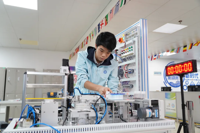 短短幾年,李冠禧已多次在省、市乃至全國(guó)的大賽中載譽(yù)而歸:在2023年的廣東省第三屆職業(yè)技能大賽中,他獲得機(jī)電一體化項(xiàng)目銅牌;在2024年全國(guó)行業(yè)職業(yè)技能大賽——第二屆全國(guó)設(shè)備管理與智能運(yùn)維職業(yè)技能大賽中,獲得設(shè)備點(diǎn)檢員項(xiàng)目二等獎(jiǎng);2025年,他在廣東省第四屆職業(yè)技能大賽中以“零失誤”的精湛技能斬獲金牌,登上廣東省技能競(jìng)賽的最高領(lǐng)獎(jiǎng)臺(tái)。 逆襲絕非坦途,這些榮譽(yù)的背后充滿了挑戰(zhàn),每一場(chǎng)比賽都對(duì)李冠禧提出了新的要求?!啊寄鼙绕矗鹊牟恢皇羌夹g(shù),還有心態(tài)和毅力?!蠋煹倪@句話,在兩次省賽受挫時(shí)點(diǎn)醒了我?!崩罟陟f(shuō),一次次比賽,讓他對(duì)電工、機(jī)電一體化行業(yè)有了更深入的了解,他將帶著磨礪來(lái)的經(jīng)驗(yàn)和技術(shù)實(shí)力參與到國(guó)賽中。 以賽促學(xué) 錘煉技能專業(yè)硬功夫 為了更好地備賽,李冠禧一頭扎進(jìn)集訓(xùn)場(chǎng)地,每天花費(fèi)10余個(gè)小時(shí)開(kāi)展項(xiàng)目訓(xùn)練,反復(fù)專研每個(gè)細(xì)節(jié),從基礎(chǔ)操作到復(fù)雜的應(yīng)急處理,他都一絲不茍地完成。 “備賽過(guò)程中也遇到不少挑戰(zhàn),高強(qiáng)度的訓(xùn)練讓身體感到很疲憊,還要補(bǔ)很多新的知識(shí)點(diǎn),比如數(shù)字孿生、電子技術(shù)等知識(shí),要花很多時(shí)間去熟悉。”李冠禧表示,備賽的過(guò)程也是個(gè)不斷學(xué)習(xí)、精進(jìn)技能的過(guò)程,只有不斷挑提升自己的技能熟練度、知識(shí)儲(chǔ)備,磨煉心態(tài)和毅力,才能在國(guó)賽的賽場(chǎng)上從容應(yīng)對(duì),發(fā)揮出最好狀態(tài)。