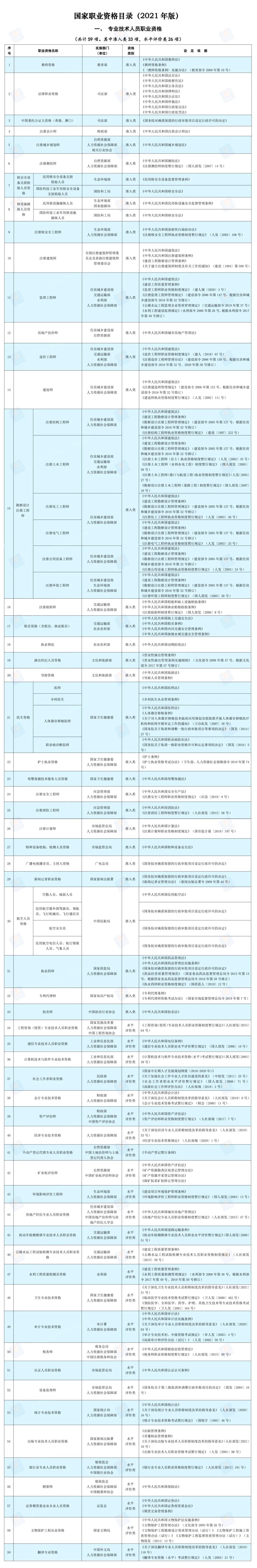 2021年版國家職業(yè)資格目錄共計(jì)72項(xiàng)職業(yè)資格。其中,專業(yè)技術(shù)人員職業(yè)資格59項(xiàng),含準(zhǔn)入類33項(xiàng),水平評價(jià)類26項(xiàng);技能人員職業(yè)資格13項(xiàng)。目錄中準(zhǔn)入類職業(yè)資格關(guān)系公共利益或涉及國家安全、公共安全、人身健康、生命財(cái)產(chǎn)安全,均有法律法規(guī)或國務(wù)院決定作為依據(jù);水平評價(jià)類職業(yè)資格具有較強(qiáng)的專業(yè)性和社會通用性,技術(shù)技能要求較高,行業(yè)管理和人才隊(duì)伍建設(shè)確實(shí)需要。