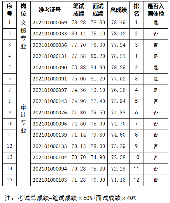 湛江市審計(jì)局2021年度公開選調(diào)公務(wù)員考試筆試和面試工作業(yè)已結(jié)束,根據(jù)《湛江市審計(jì)局2021年度公開選調(diào)公務(wù)員公告》的要求,現(xiàn)將總成績及入圍體檢人員名單予以公布(詳見附表),如排名前者因體檢不合格,則按總成績從高分到低分的順序依次遞補(bǔ)入圍體檢。體檢相關(guān)事宜及有關(guān)要求我局將通過“粵政易”通知,望入圍體檢考生注意查收。